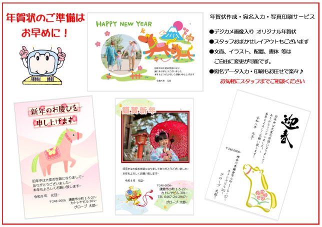 2025年11月15日 / 最終更新日時 : 2025年11月15日 globe お知らせ 年賀状のご準備はお早めに! 年賀状作成承ります。スタッフお任せデザイン、こだわりデザイン、デジカメ画像、イラスト挿入、お気軽にご相談ください。 はがき宛名印刷、宛名ラベル印刷、宛名入力も承ります。 お早めにスタッフまでご相談ください。 FacebookXBlueskyHatenaCopy