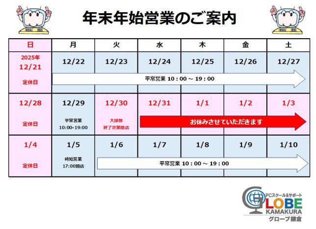 年末年始の営業日のご案内